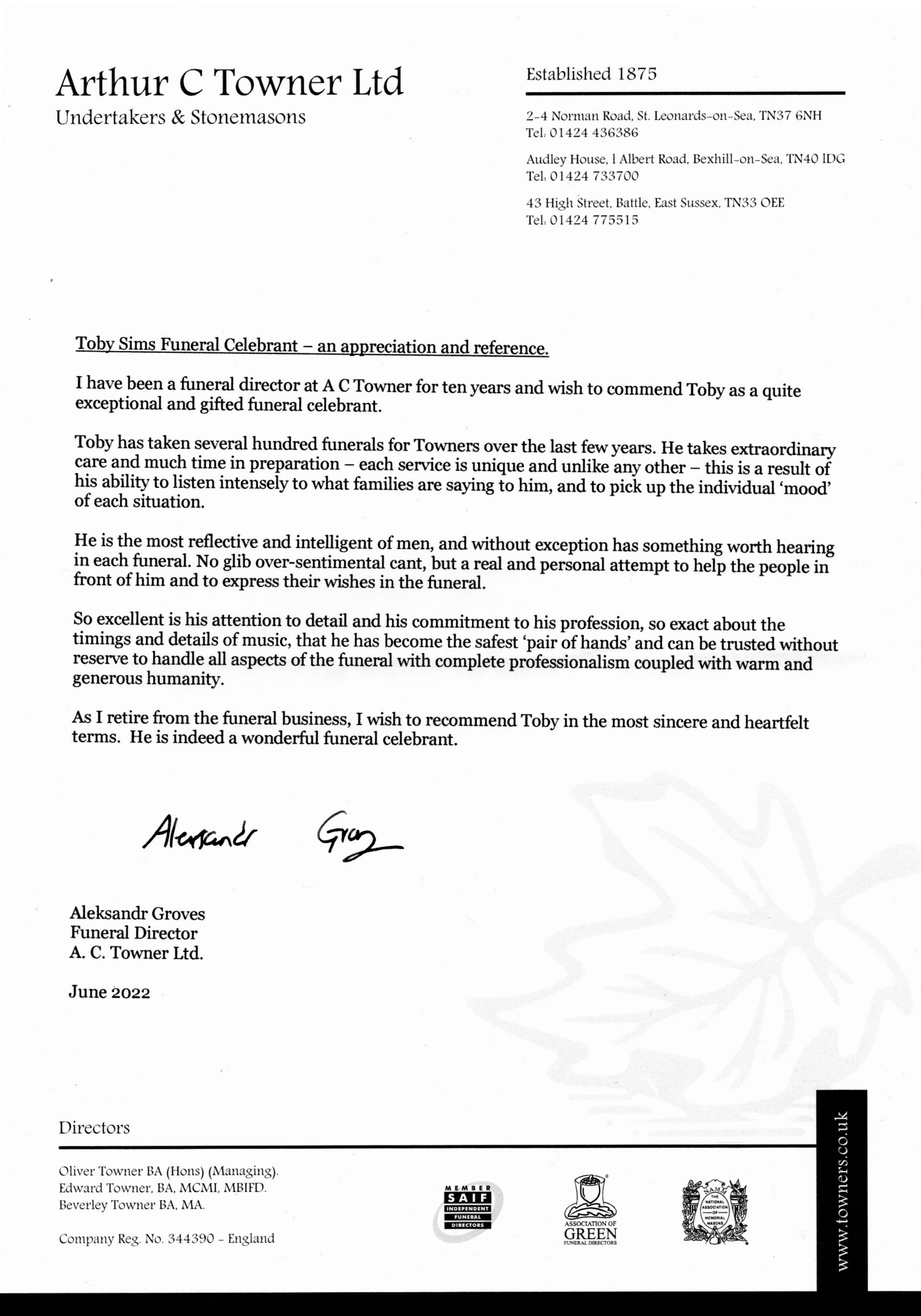 I have been a funeral director at A C Towner for ten years and wish to commend Toby as a quite exceptional and gifted celebrant.